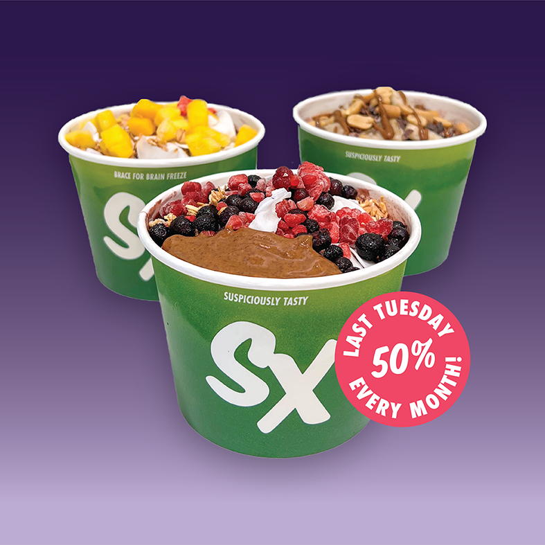 den siste tirsdagen hver måned har vi 50% rabatt på alle acai bowls i alle våre butikker - også kalt "Bowl tuesday"!